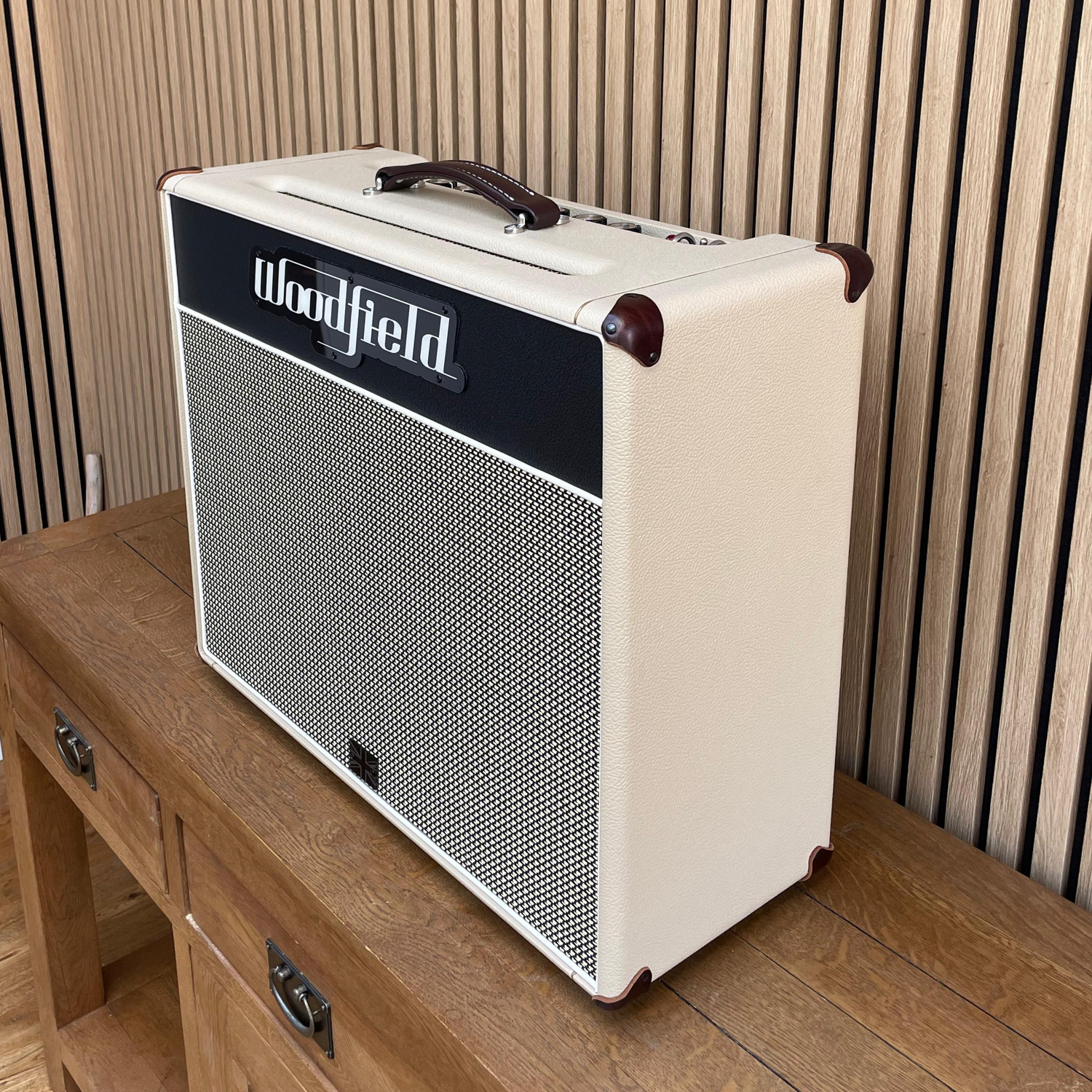 Blonde/Cream Tolex cabinet with a black front panel and a salt and pepper grill