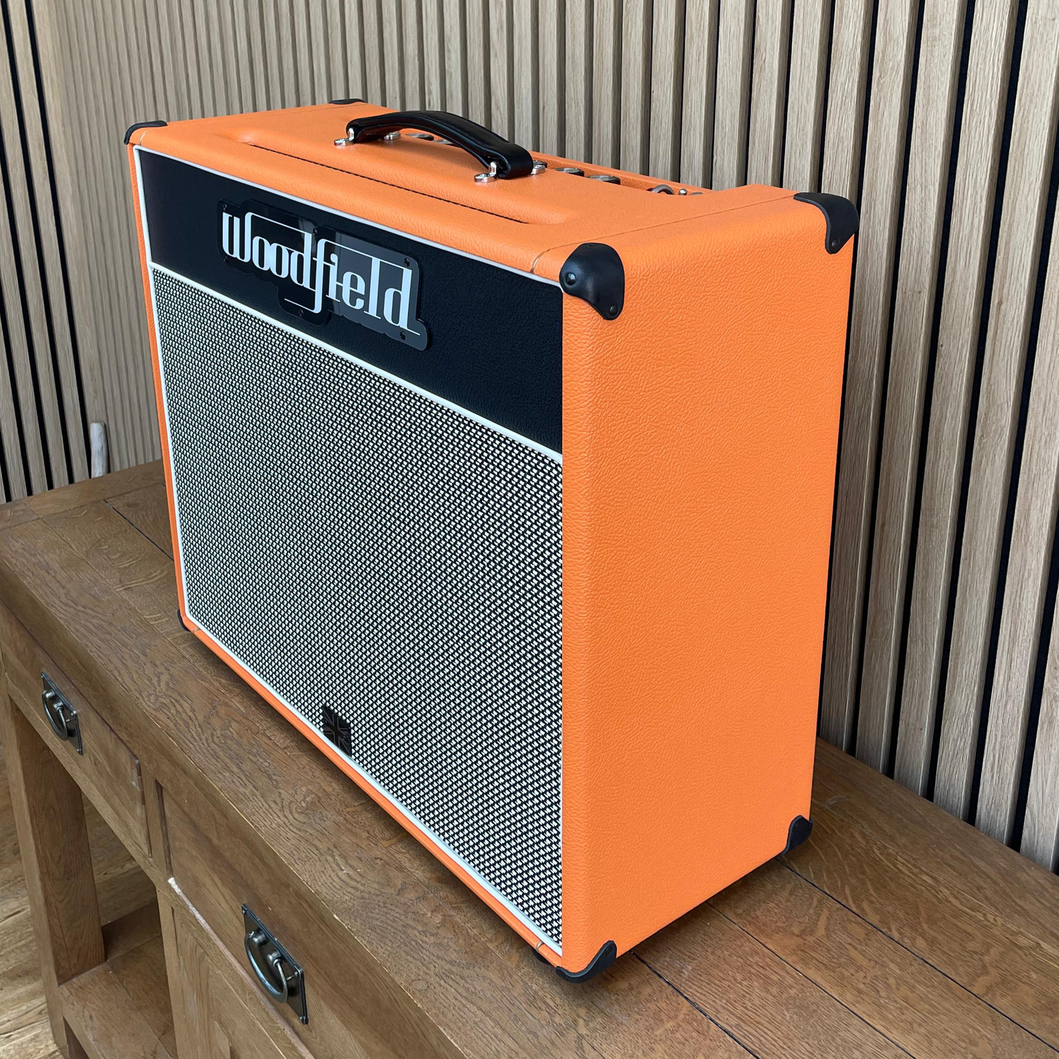 Orange Tolex cabinet with a black front panel and a salt and pepper grill
