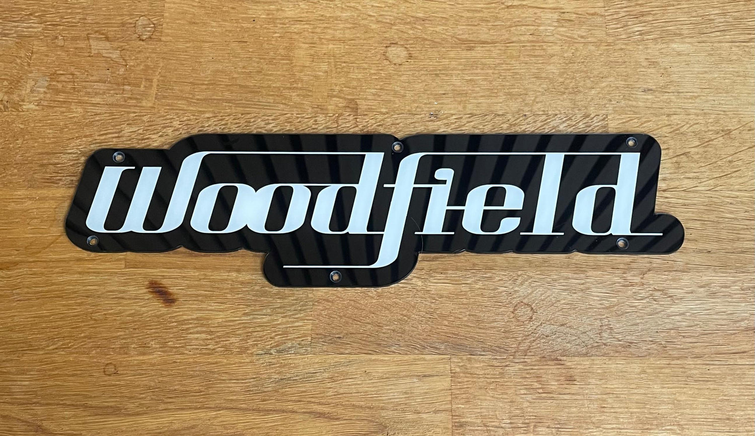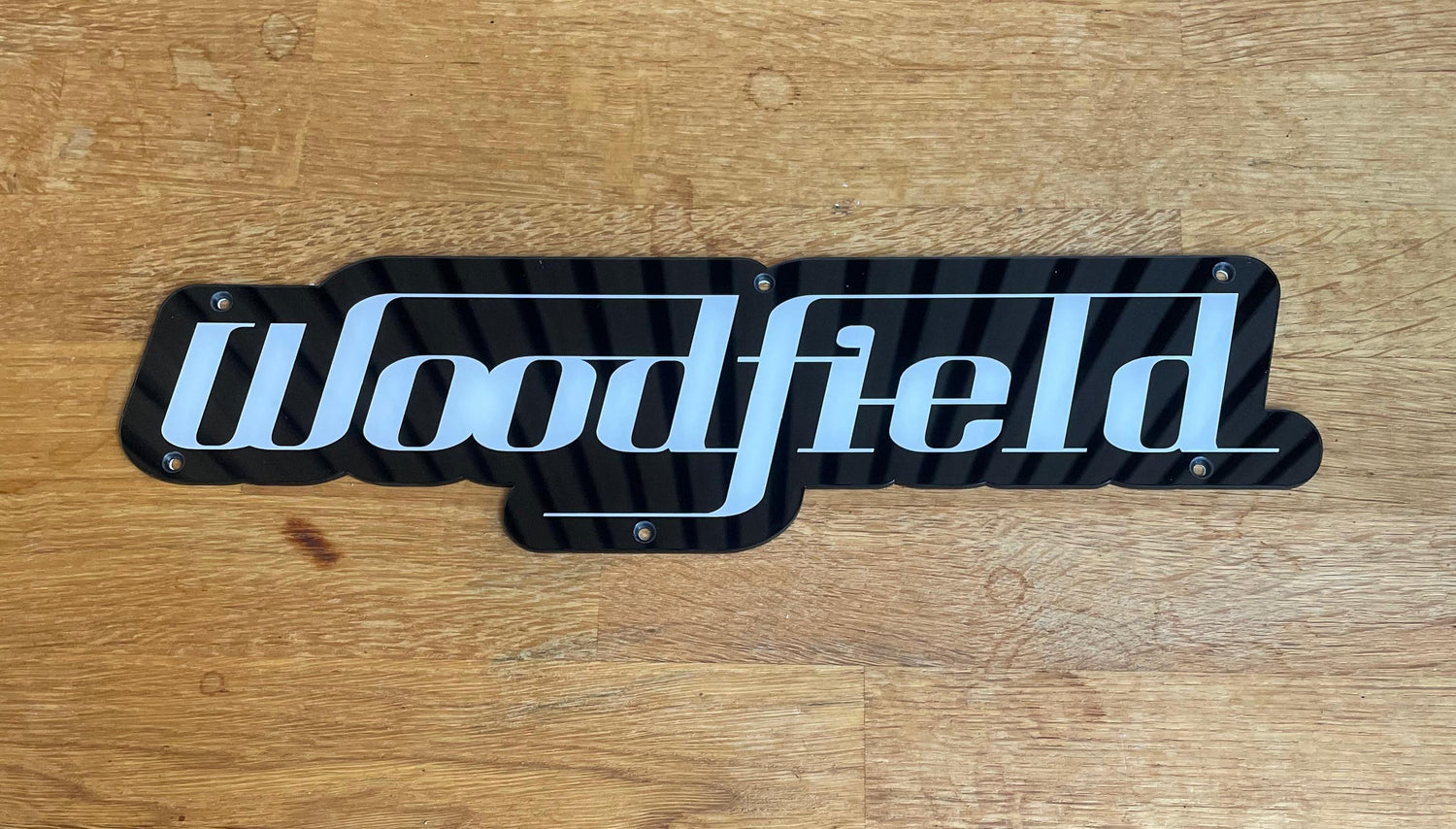 Woodfield Logo in a brighter white lettering (Matches the cabinet piping) on a black background