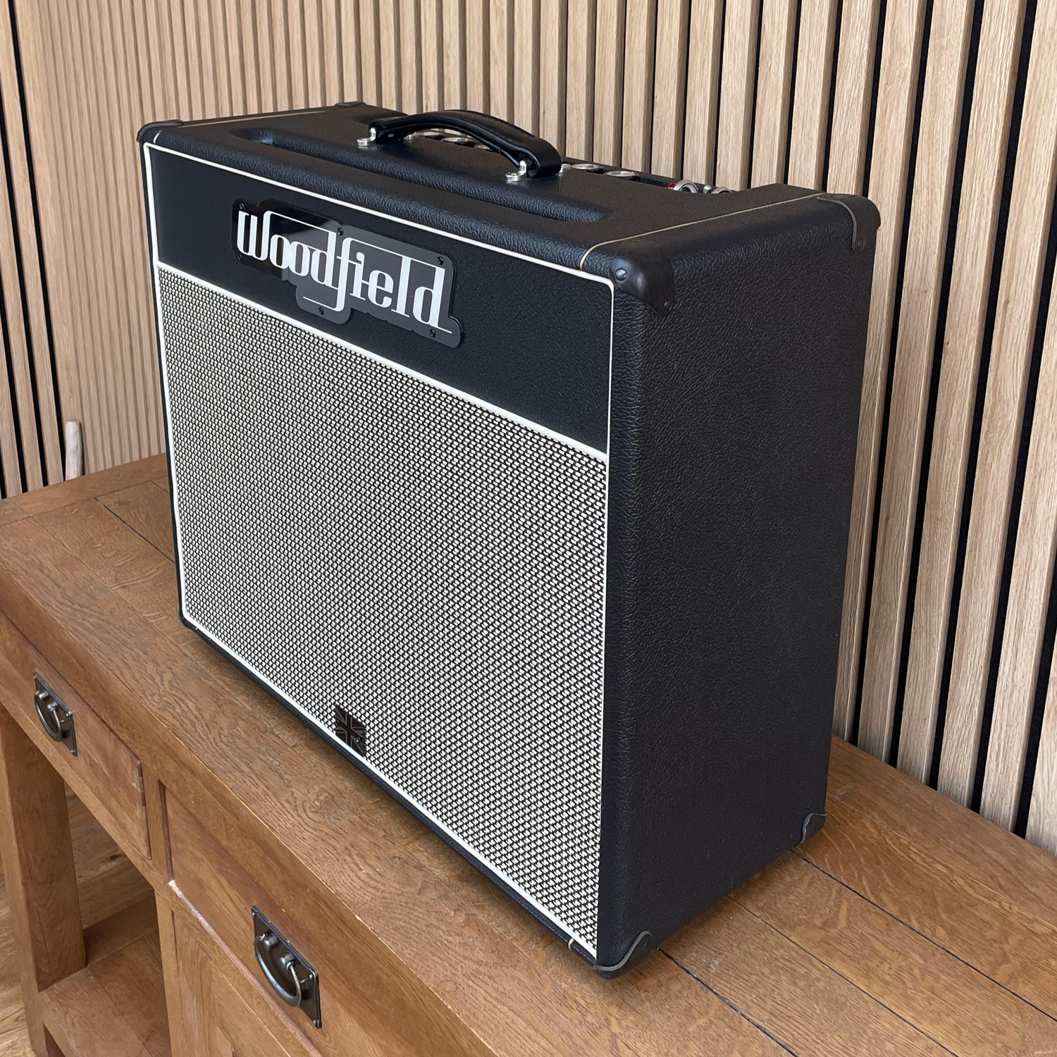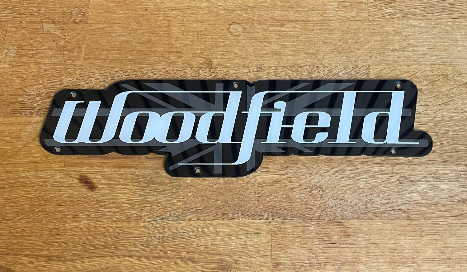 Woodfield Logo in a brighter white lettering (Matches the cabinet piping) with a faded Union Jack on a black background
